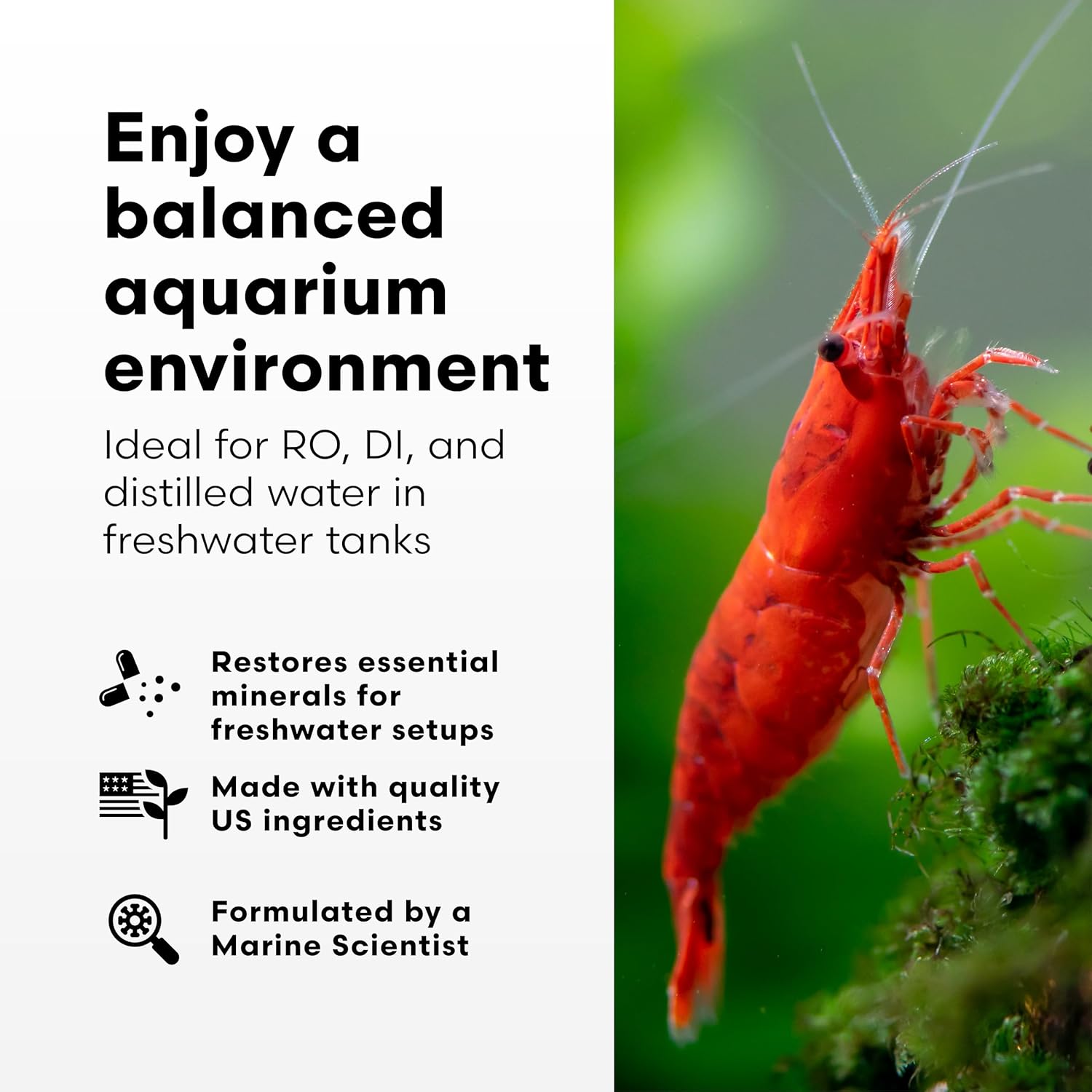 - Establishes an optimal mineral balance in water that has been purified, filtered, (reverse osmosis, deionization, distilled etc.) or is exceedingly soft (well water in forested regions) for all freshwater aquariums