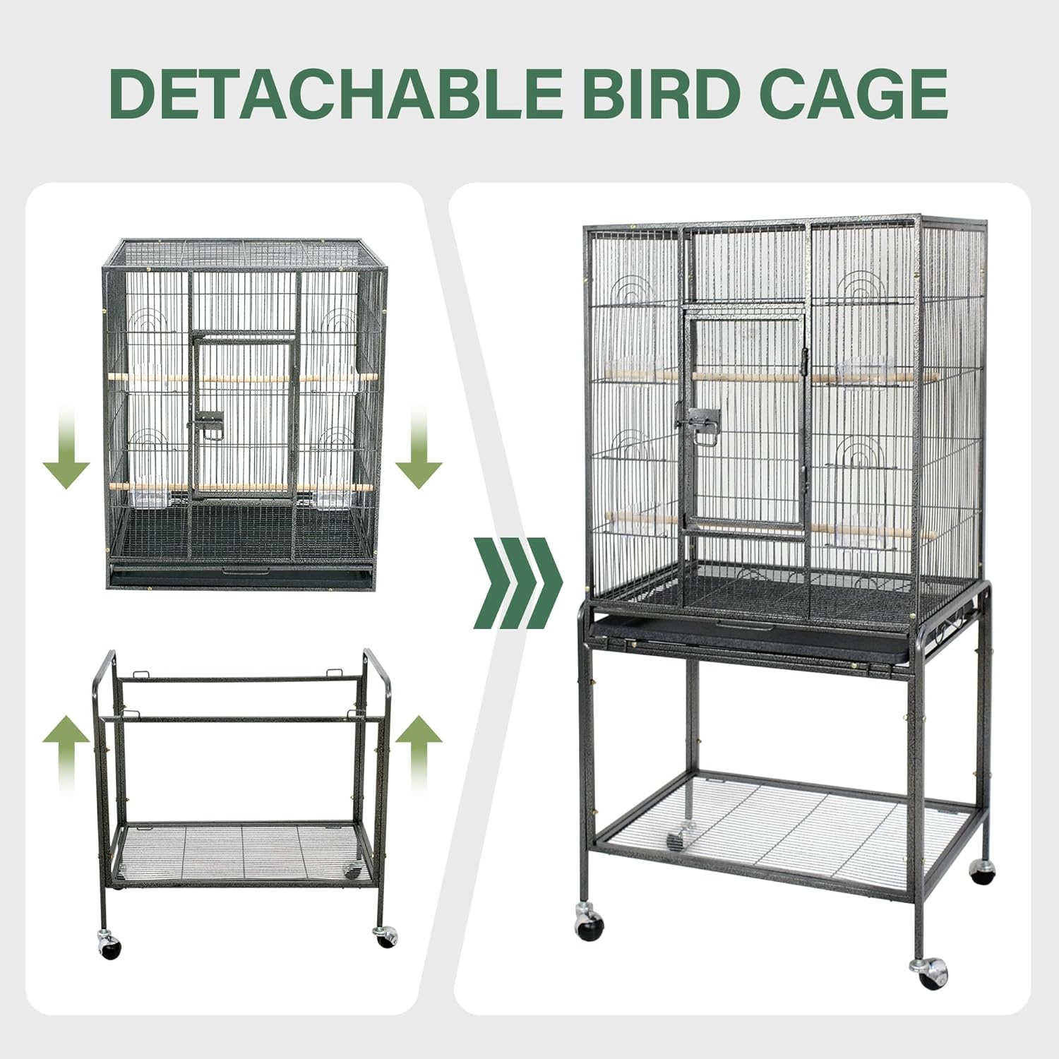 - 【Removable Tray】- The bottom grill and tray of this bird cage are removable for easy cleaning. And it includes 4 plastic cups for water and food, 2 perches that the birds can sit on and play.