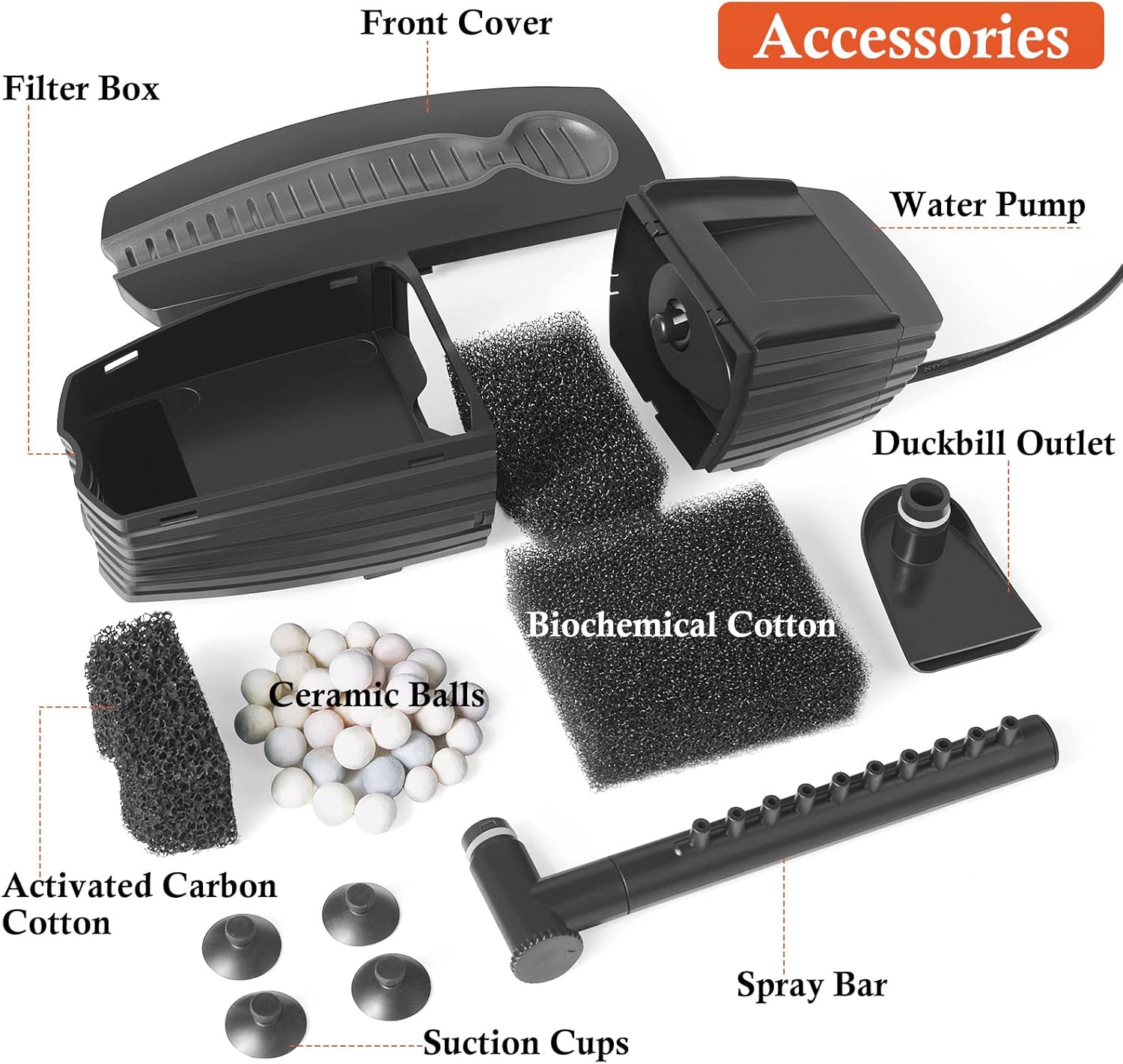 - 【Three Filter Media, Four Filter Procedures】This fish tank filter has three kinds of filter media: 1pc Activated Carbon Cotton, 2pcs Biochemical Cotton and some Ceramic Balls. After the water enters the filter, it goes through four filter procedures to be completely filtered, then sprays out from the outlet.