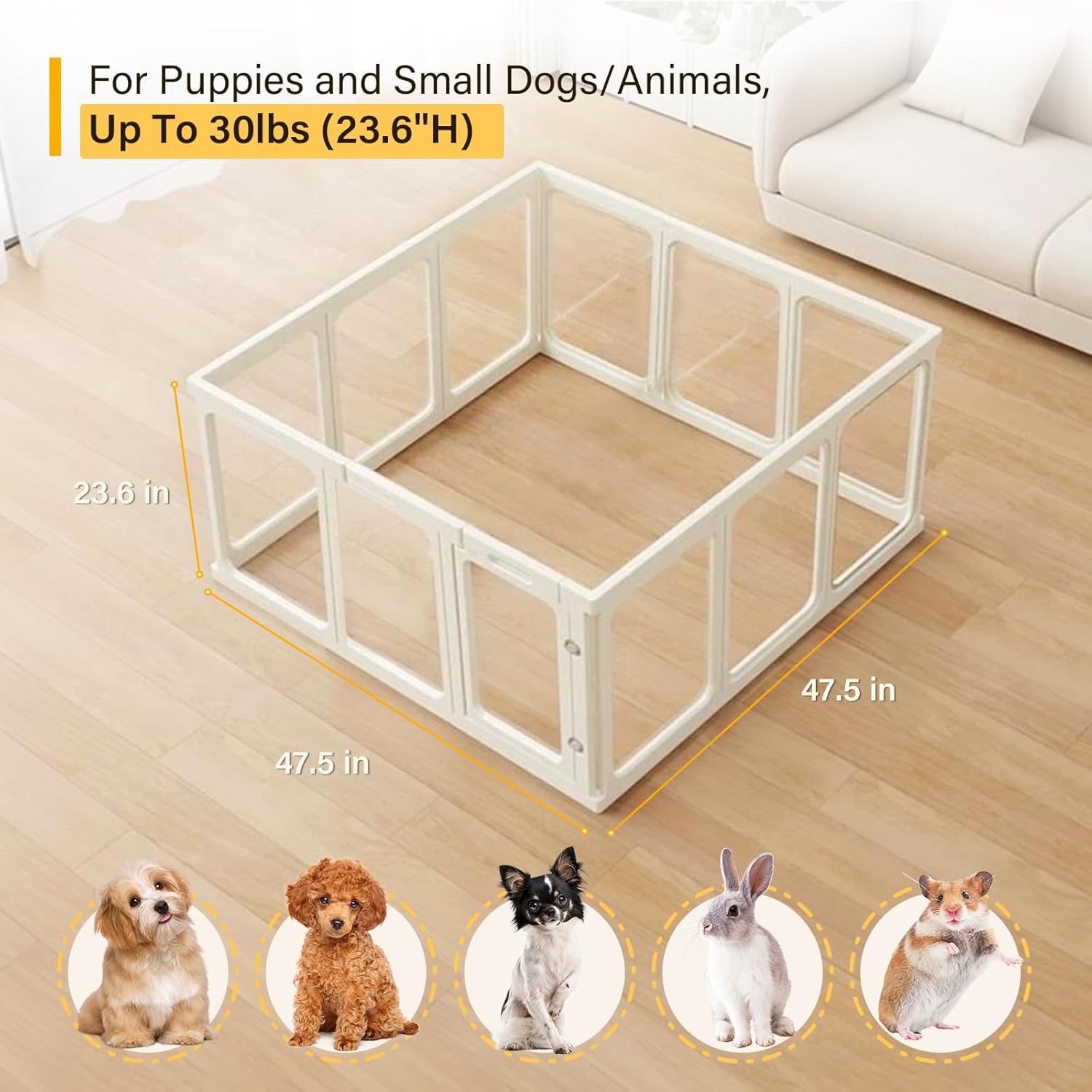 - 【Spacious Design】 With dimensions of 47.5in L x 47.5in W x 23.6in H and 12 panels, this clear dog play pen provides ample space for your pets to move around comfortably. The spacious design ensures they have plenty of room to play and explore.